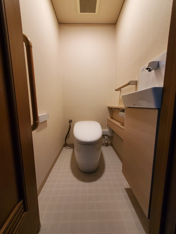 手洗器を入口のほうに欲しいので、狭くならないようにタンクレスご希望されました。床のクッションフロアと壁のクロスはシンプルなものを選ばれました。 TOTOネオレストRS3手洗い付き、便器はホワイトカウンターはライトウッドです。思ってたよりも狭くならずお客様にも快適とお聞きできて良かったです。
